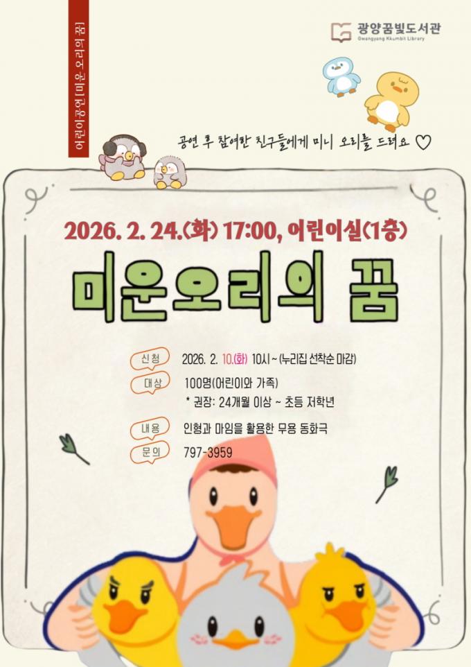 [½Ã»çÁ¾ÇսŹ® = Àå¹Î±Ô ±âÀÚ] ±¤¾ç²Þºûµµ¼­°üÀº µ¿È­ ¡®¹Ì¿î ¿À¸® »õ³¢¡¯¸¦ Çö´ëÀûÀ¸·Î ÀçÇØ¼®ÇÑ ¾î¸°ÀÌ ¹«¿ë µ¿È­±Ø ¡¸¹Ì¿î ¿À¸®ÀÇ ²Þ¡¹À» ¿À´Â 2¿ù 24ÀÏ, µµ¼­°ü¿¡¼­ ¾î¸°ÀÌ¿Í °¡Á· °ü°´À» ´ë»óÀ¸·Î ¼±º¸ÀÎ´Ù°í ¹àÇû´Ù. À̹ø °ø¿¬Àº ´Ù¸¥ »öÀ» °¡Á³´Ù´Â ÀÌÀ¯·Î ÁÖº¯°ú ¾î¿ï¸®Áö ¸øÇÏ´Â ¾Æ±â ¿À¸®°¡ ÀڽŸ¸ÀÇ Æ¯º°ÇÔÀ» ¹ß°ßÇØ ³ª°¡´Â °úÁ¤À» ±×¸° ÀÛǰÀ¸·Î, ¡®´Ù¸§Àº Ʋ¸²ÀÌ ¾Æ´Ï¶ó Ưº°ÇÔ¡¯À̶ó´Â µû¶æÇÑ ¸Þ½ÃÁö¸¦ ÀüÇÑ´Ù.