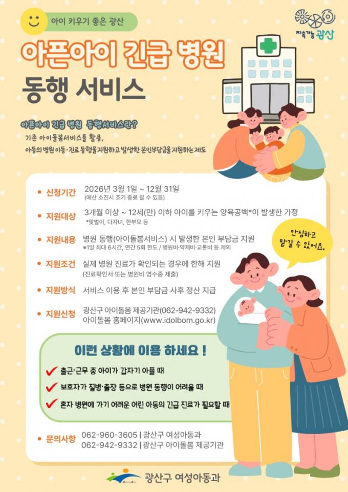 [½Ã»çÁ¾ÇսŹ® = ¿À½ÂÅà ±âÀÚ] ±¤ÁÖ ±¤»ê±¸°¡ 3¿ù 1ÀϺÎÅÍ ºÎ¸ð°¡ °ç¿¡ ¾ø°Å³ª µ¹ºÁÁֱ⠾î·Á¿î »óȲ¿¡¼­ °©ÀÛ½º·´°Ô Áø·á°¡ ÇÊ¿äÇÑ ¾Æµ¿À» À§ÇÑ ¡®¾ÆÇ ¾ÆÀÌ ±ä±Þ º´¿ø µ¿Ç࡯ ¼­ºñ½º¸¦ ½ÃÇàÇÑ´Ù.