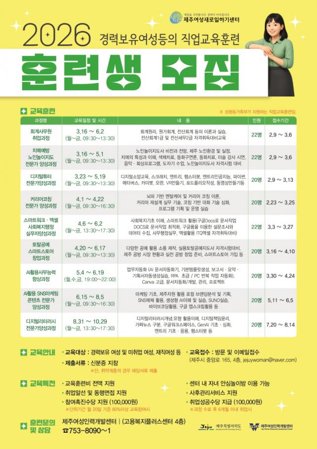 ¼¾Åͺ°·Î º¸¸é Á¦ÁÖ¿©¼º»õÀϼ¾ÅÍ´Â ¡âAIȰ¿ë SNS¸¶ÄÉÆÃ ÄÜÅÙÃ÷ Àü¹®°¡ ¾ç¼º ¡âAIȰ¿ë »ç¹«´É·Â Çâ»ó ¡âµðÁöÅи®ÅÍ·¯½Ã Àü¹®°¡ ¾ç¼º ¡âµðÁöÅÐ Æ©ÅÍ Àü¹®°¡ ¾ç¼º ¡âȸ°è»ç¹«¿ø Ãë¾÷ ¡â½º¸¶Æ®¿öÅ©¡¤¿¢¼¿ »çȸº¹ÁöÇàÁ¤ ½Ç¹«ÀÚ ¾ç¼º ¡âÅäÅ»°ø¿¹ ½º¸¶Æ®½ºÅä¾î â¾÷ ¡âÄ¿¸®¾îÄÚĪ Àü¹®°¡ ¾ç¼º ¡âÄ¡¸Å¿¹¹æ ³ëÀγîÀÌÁöµµ Àü¹®°¡ ¾ç¼º µî 9°³ °úÁ¤¿¡¼ 186¸íÀ» ¼±¹ßÇÑ´Ù.