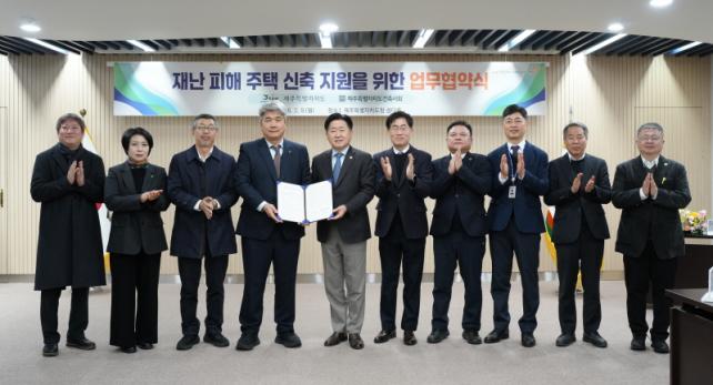 Á¦ÁÖµµ´Â 9ÀÏ µµÃ» »ï´ÙȦ¿¡¼ ´ëÇѰÇÃà»çÇùȸ Á¦ÁÖµµ °ÇÃà»çȸ¿Í ¡®Àç³ ÇÇÇØÁÖÅà ½ÅÃà Áö¿øÀ» À§ÇÑ ¾÷¹«Çù¾à¡¯À» ü°áÇß´Ù. Àç³ ÇÇÇØ ÁÖÅÃÀÇ ½Å¼ÓÇÑ º¹±¸¿Í ÇÇÇØ ÁÖ¹ÎÀÇ °æÁ¦Àû ºÎ´ã ¿ÏȰ¡ ¸ñÇ¥´Ù.