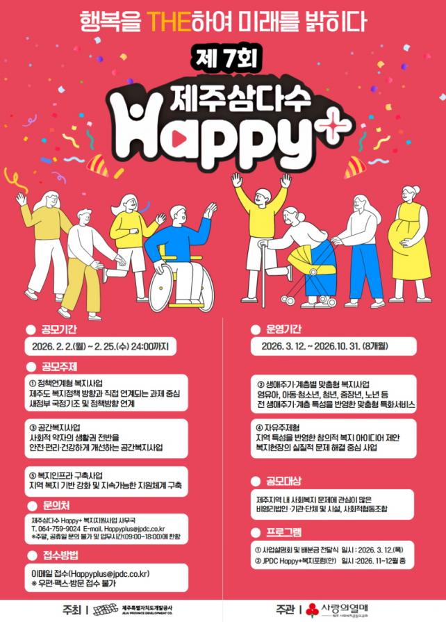 Âü¿©¸¦ Èñ¸ÁÇÏ´Â ´Üü´Â ¿À´Â 2¿ù 25ÀϱîÁö Á¦ÁÖ°³¹ß°ø»ç ȨÆäÀÌÁö(www.jpdc.co.kr), Á¦ÁÖ»çȸº¹Áö°øµ¿¸ð±Ýȸ ȨÆäÀÌÁö(https://jeju.chest.or.kr/base.do)¿¡¼ ½Åû ¼·ù¸¦ ³»·Á¹Þ¾Æ ÀÛ¼º ÈÄ À̸ÞÀÏ(happyplus@jpdc.co.kr)·Î Á¦ÃâÇÏ¸é µÈ´Ù. ÀÚ¼¼ÇÑ »çÇ×Àº Á¦ÁÖ»ï´Ù¼ö Happy+º¹Áö °ø¸ð»ç¾÷ »ç¾÷±¹(064-759-9024)À» ÅëÇØ ¹®ÀÇÇÒ ¼ö ÀÖ´Ù.