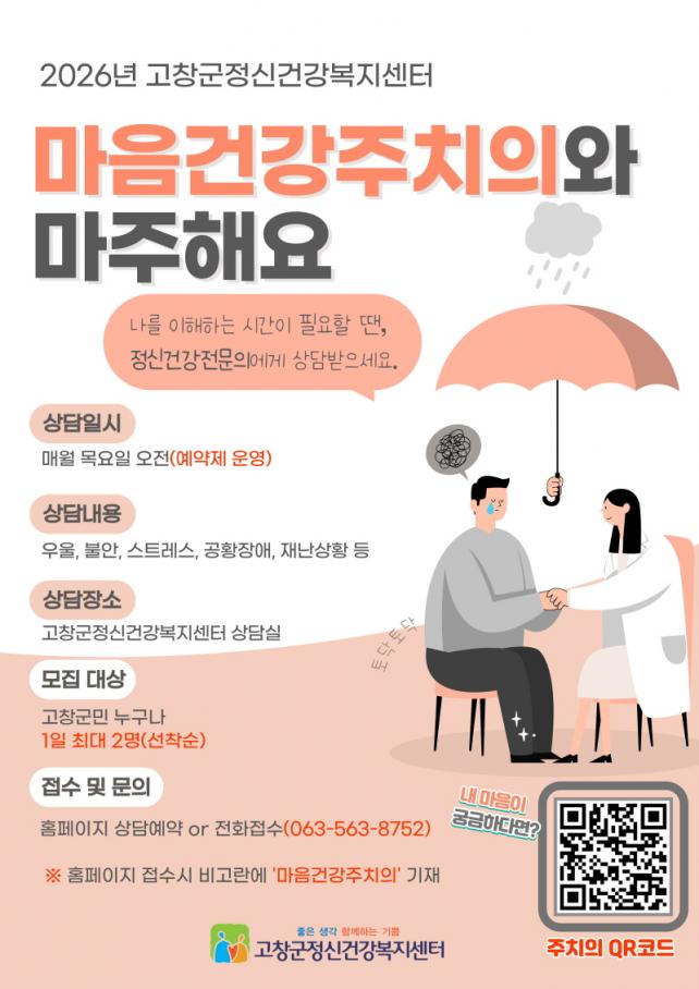 ÇØ´ç »ç¾÷Àº Á¤½Å°Ç°º¹Áö¼¾ÅÍ ³»¼Ò »ó´ã°ú ã¾Æ°¡´Â ¹æ¹®»ó´ã ÇüÅ·Π°ÝÁÖ ¿î¿µµÈ´Ù. ½ÅûÀº Á¤½Å°Ç°º¹Áö¼¾ÅÍ È¨ÆäÀÌÁö ¶Ç´Â Àüȸ¦ ÅëÇØ °¡´ÉÇÏ´Ù. ¿ì¿ï°¨À̳ª ½É¸®Àû ¾î·Á¿òÀ» °Þ°í ÀÖ´Â Áö¿ªÁÖ¹ÎÀ̶ó¸é ´©±¸³ª ¹«·á·Î ÀÌ¿ëÇÒ ¼ö ÀÖ´Ù.