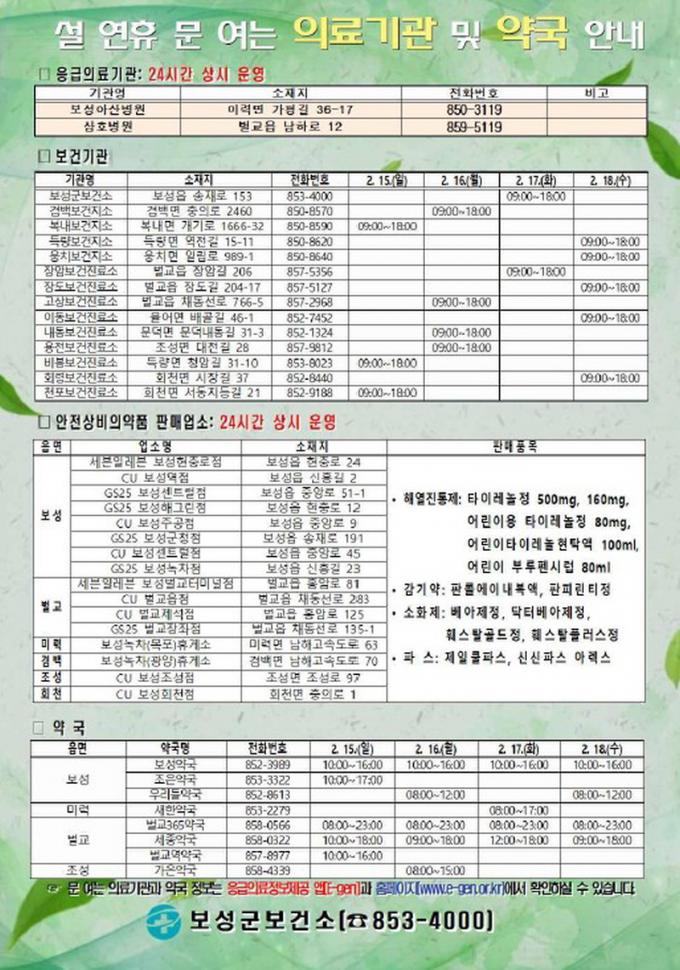 º¸°Ç ºÐ¾ß¿¡¼´Â º¸¼º¾Æ»êº´¿ø°ú »ïÈ£º´¿ø ÀÀ±Þ½Ç 24½Ã°£ ¿î¿µ, ´çÁ÷ÀÇ·á±â°ü ¹× ÈÞÀÏ ¾à±¹ ÁöÁ¤ ¿î¿µ, º¸°ÇÁö¼Ò¡¤º¸°ÇÁø·á¼Ò ÁÖ°£ Áø·á ü°è¸¦ À¯ÁöÇÑ´Ù. °¨¿°º´ ´ëÀÀÀ» À§ÇØ 24½Ã°£ ºñ»ó ¹æ¿ª ¿¬¶ô ü°èµµ °¡µ¿ÇÑ´Ù.