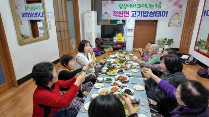 ¾Æ¿ï·¯ °°Àº ³¯ ±ºÀÚ°æ·Î´ç¿¡¼´Â °í±â¹ä»óµ¥ÀÌ Ã¹ ½ÃÀÛÀ» ±â³äÇÏ´Â ½Ä»çÀÚ¸®°¡ ¸¶·ÃµÆ´Ù. ¸¶À» ¾î¸£½ÅµéÀº ³ó¾÷ȸ»ç¹ýÀΠû»î¿¡¼ ±âºÎ¹ÞÀº »óÃß¿¡ °íÇâ»ç¶û±âºÎ±ÝÀ¸·Î Á¦°øµÈ µÅÁö°í±â·Î ´Ü¹éÁú°ú ºñŸ¹Î µÎ ¸¶¸® Åä³¢¸¦ Àâ´Â ½Ä»ç¸¦ Á¦°ø¹Þ¾Ò´Ù.