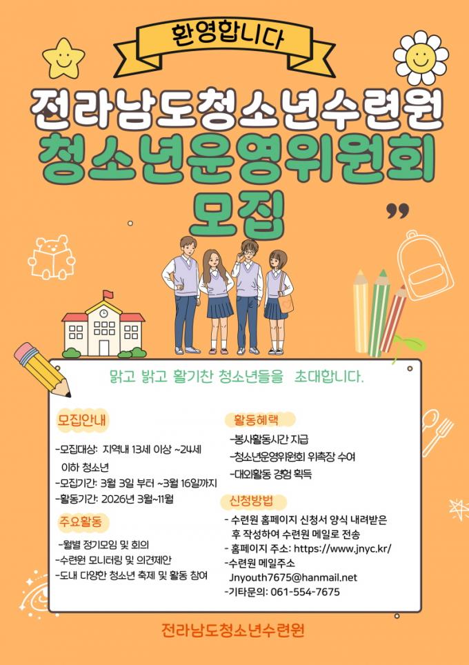 Áö¿ø ´ë»óÀº Àü¶ó³²µµ ³» °ÅÁÖÇÏ´Â 13¼¼¿¡¼ 24¼¼ û¼Ò³âÀ̸ç, Èñ¸ÁÀÚ´Â Àü¶ó³²µµÃ»¼Ò³â¼ö·Ã¿ø ȨÆäÀÌÁö ¹× SNS °øÁö»çÇ×À» Âü°íÇÏ¿©, ½Åû¼ ¾ç½ÄÀ» ¼ö·Ã¿ø ȨÆäÀÌÁö¿¡¼ ´Ù¿î¹Þ¾Æ ÀÛ¼ºÇÏ¿© ¸ÞÀÏ·Î ¼ÛºÎÇÏ¸é µÈ´Ù. ÀÚ¼¼ÇÑ »çÇ×Àº Àü¶ó³²µµÃ»¼Ò³â¼ö·Ã¿ø ¼ö·Ã¿î¿µÆÀ(061-554-7675)·Î ¹®ÀÇÇÏ¸é µÈ´Ù