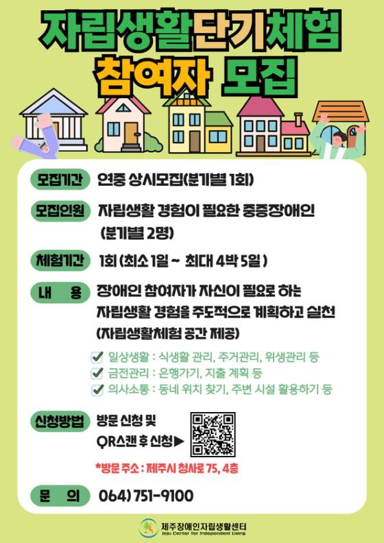 ¸ðÁýÀοøÀº ¸¸ 18¼¼ ÀÌ»ó Á¦ÁÖÁö¿ª¿¡ °ÅÁÖÇÏ´Â ÁßÁõÀå¾ÖÀÎ 2¸íÀ̸ç, ÀÚ¸³Ã¼ÇèÀº ÃÖ¼Ò 1ÀÏ¿¡¼ ÃÖ´ë 4¹Ú 5Àϰ£ ÀÏ»ó»ýȰ(ÁÖ°Å‧½Ä»ýȰ‧À§»ý °ü¸® µî) ±âº» üÇè°ú ÀÚ±â°áÁ¤±Ç°ú ¿å±¸¸¦ Áß½ÉÀ¸·Î ÇÑ »çȸÂü¿© Ȱµ¿À» Áö¿øÇÑ´Ù.