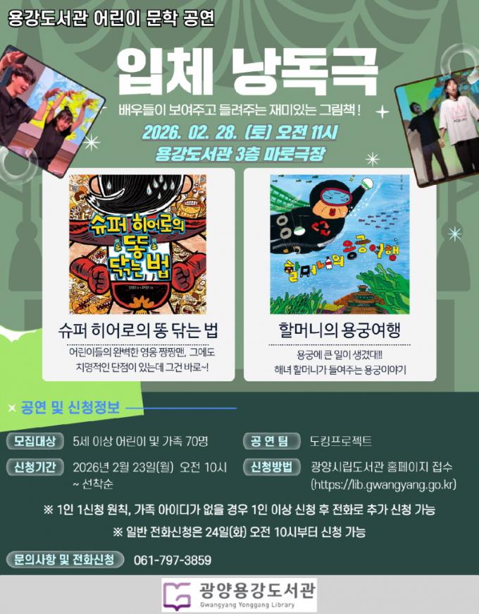 À̹ø °ø¿¬Àº ´ëÇзΠ¿¬±Ø¹è¿ìµéÀÌ ÁÖÃàÀÌ µÇ¾î ¹®Çаú °ø¿¬¿¹¼ú Á¢¸ñÇØ ÀÔü³¶µ¶±ØÀ» ±âȹ¡¤Á¦ÀÛ¡¤°ø¿¬ÇÏ´Â ¡®µµÅ·ÇÁ·ÎÁ§Æ®¡¯°¡ ÁøÇàÇϸç, ¡ãÀÔü³¶µ¶±Ø ¼Ò°³ ¡ã¡¸ÇÒ¸Ó´ÏÀÇ ¿ë±Ã ¿©Çࡹ ³¶µ¶±Ø ¡ã¡¸½´ÆÛ È÷¾î·ÎÀÇ ¶Ë ´Û´Â ¹ý¡¹ ³¶µ¶±Ø ¡ã±â³äÃÔ¿µ ¼øÀ¸·Î ¿î¿µµÈ´Ù. °ü¶÷Àº ±¤¾ç½Ã ¾î¸°ÀÌ¿Í °¡Á· 70¸íÀ» ´ë»óÀ¸·Î ÁøÇàµÉ ¿¹Á¤ÀÌ´Ù.