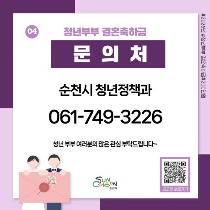 [½Ã»çÁ¾ÇսŹ® = ¿À½ÂÅà ±âÀÚ] ¼øÃµ½Ã´Â û³â¼¼´ëÀÇ °áÈ¥ Ãʱ⠰æÁ¦Àû ºÎ´ãÀ» ¿ÏÈ­ÇÏ°í ¾ÈÁ¤ÀûÀÎ Áö¿ª Á¤ÂøÀ» Áö¿øÇϱâ À§ÇØ ¡¸2026³â û³â ºÎºÎ °áÈ¥ÃàÇÏ±Ý Áö¿ø»ç¾÷¡¹À» ½ÃÇàÇϰí, ºÎºÎ´ç 200¸¸ ¿øÀÇ °áÈ¥ÃàÇϱÝÀ» Áö±ÞÇÑ´Ù°í ¹àÇû´Ù.