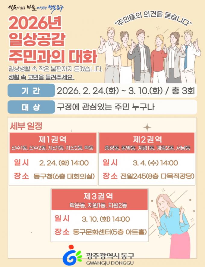 ¡®ÀÏ»ó°ø°¨ ÁֹΰúÀÇ ´ëÈ¡¯´Â ÀÌ´Þ 24ÀÏ ¿ÀÈÄ 2½Ã, »ê¼ö1¡¤»ê¼ö2¡¤Áö»ê1¡¤Áö»ê2¡¤Çе¿ ÁÖ¹ÎÀ» ´ë»óÀ¸·Î µ¿±¸Ã» 6Ãþ ´ëȸÀǽǿ¡¼ ù ¹®À» ¿¬´Ù. À̾î 3¿ù 4ÀÏ ¿ÀÈÄ 2½Ã¿¡´Â ÃæÀ塤µ¿¸í¡¤°è¸²1¡¤°è¸²2¡¤¼³²µ¿ ÁÖ¹ÎÀ» ´ë»óÀ¸·Î ÀüÀϺôµù 245 8Ãþ ´Ù¸ñÀû°´ç¿¡¼ µÎ ¹øÂ° ¸¸³²ÀÌ ÁøÇàµÈ´Ù. ¸¶Áö¸·À¸·Î 3¿ù 10ÀÏ ¿ÀÈÄ 2½Ã¿¡´Â Çп°ú Áö¿ø1¡¤Áö¿ø2µ¿ ÁֹεéÀÌ µ¿±¸¹®È¼¾ÅÍ 5Ãþ ¾ÆÆ®È¦¿¡¼ ±¸¿Í ¸¶ÁÖ ¾É°Ô µÈ´Ù.