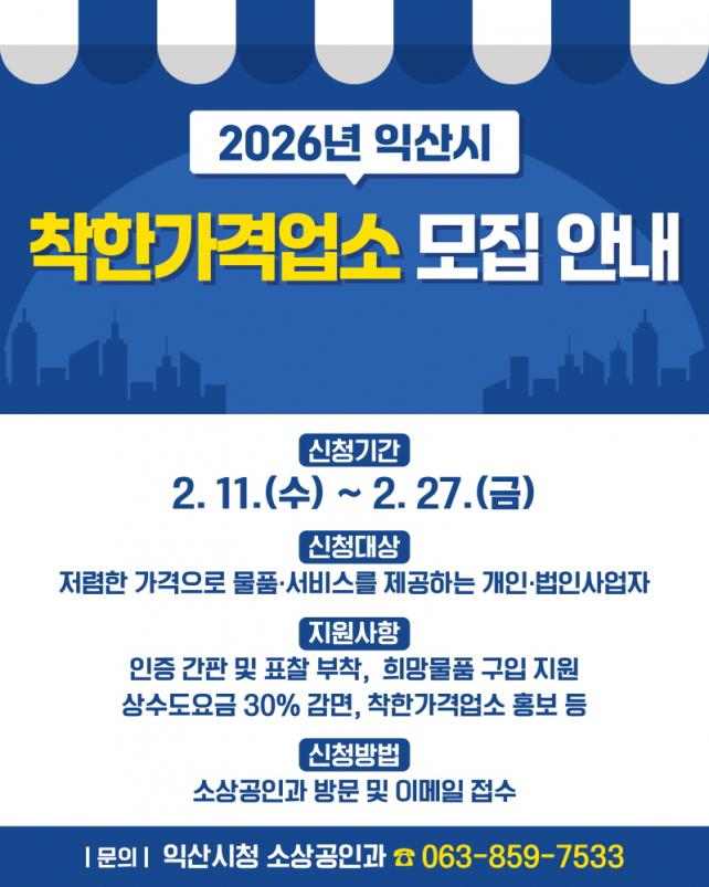 Âü¿©¸¦ Èñ¸ÁÇÏ´Â ¾÷¼Ò´Â ÀÍ»ê½Ã ¼Ò»ó°øÀΰú¸¦ ¹æ¹®Çϰųª ÀüÀÚ¿ìÆíÀ¸·Î ½ÅûÇÏ¸é µÈ´Ù. ½Ã´Â ½Åû Á¢¼ö ÈÄ °¡°Ý, À§»ý¡¤Ã»°á, Ä£Àýµµ µî¿¡ ´ëÇÑ ÇöÁö½Ç»ç¿Í °øÁ¤ÇÑ Æò°¡¸¦ °ÅÃÄ ÃÖÁ¾ ÁöÁ¤ ¿©ºÎ¸¦ °áÁ¤ÇÒ ¿¹Á¤ÀÌ´Ù. ÀÚ¼¼ÇÑ ³»¿ëÀº ÀÍ»ê½Ã ´©¸®Áý(iksan.go.kr)¿¡¼­ È®ÀÎÇÏ¸é µÈ´Ù.