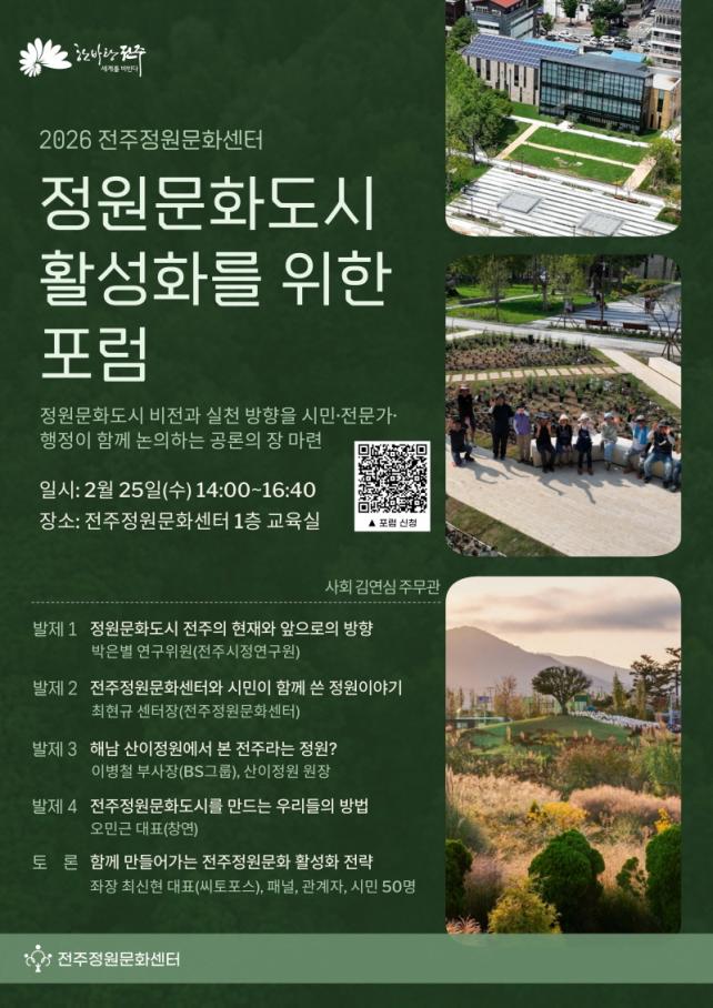 ¸¶Áö¸· ¼¼¼ÇÀÎ ¡®ÇÔ²² ´äÀ» ã´Ù¡¯¿¡¼´Â ¡®2026³â ´ëÇѹα¹ ÀüÁÖÁ¤¿ø»ê¾÷¹Ú¶÷ȸ¡¯ÀÇ Á¶Á÷À§¿øÀåÀ¸·Î Ȱµ¿ ÁßÀÎ ÃÖ½ÅÇö ¾¾ÅäÆ÷½º ´ëÇ¥¸¦ ÁÂÀåÀ¸·Î, Á¤¹®¼± ûÁÖ´ëÇб³ ±³¼ö¿Í À̼±Èñ (»ç)´õ½£ »ç¹«±¹Àå, Á¤Çý¸í Á¤¿ø ¡®¹Ö½º°¡µç¡¯ ´ëÇ¥ µî 3¸íÀÇ ÆÐ³ÎÀÌ Âü¿©ÇÑ °¡¿îµ¥ ¡®ÇÔ²² ¸¸µé¾î°¡´Â ÀüÁÖÁ¤¿ø¹®È Ȱ¼ºÈ Àü·«¡¯À» ÁÖÁ¦·Î Åä·Ð¿¡ ³ª¼±´Ù.