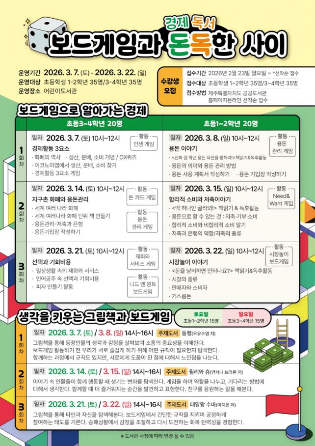 À̹ø ÇÁ·Î±×·¥Àº 3¿ù 7ÀÏ(Åä)ºÎÅÍ 22ÀÏ(ÀÏ)±îÁö ¾î¸°À̵µ¼­°ü¿¡¼­ ¡ãº¸µå°ÔÀÓÀ¸·Î ¾Ë¾Æ°¡´Â °æÁ¦ ¡ã»ý°¢À» Ű¿ì´Â ±×¸²Ã¥°ú º¸µå°ÔÀÓ µî 2°³ °úÁ¤À¸·Î ÁøÇàµÈ´Ù.