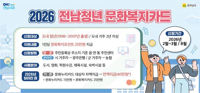 Àü³² û³â ¹®Èº¹ÁöÄ«µå´Â Áö¿ª û³â¿¡°Ô ¹®È Ȱµ¿ºñ¸¦ Áö¿øÇØ ¹®È»ýȰ°ú ÀÚ±â°è¹ß ±âȸ¸¦ Á¦°øÇÏ´Â »ç¾÷À¸·Î, ´ë»óÀÚ 1ÀÎ´ç ¿¬ 25¸¸ ¿øÀÇ ¹®Èº¹Áö Æ÷ÀÎÆ®¸¦ Áö±ÞÇÑ´Ù.