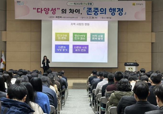 [½Ã»çÁ¾ÇսŹ® = ¿À½ÂÅà ±âÀÚ] Àü¶ó³²µµ´Â 24ÀÏ µµÃ» ¿ÕÀνǿ¡¼­ °øÁ÷ÀÚ 300¿© ¸íÀ» ´ë»óÀ¸·Î ÀÌÁø¾Æ ºê·£µåÀ¯¸®´õ½Ê¼¾ÅÍ ¼ÒÀåÀ» ÃÊÃ»ÇØ ¡®´Ù¾ç¼ºÀÇ Â÷ÀÌ, Á¸ÁßÀÇ ÇàÁ¤¡¯À» ÁÖÁ¦·Î Á¦302ȸ Àü³²Æ÷·³À» ¿­¾ú´Ù.