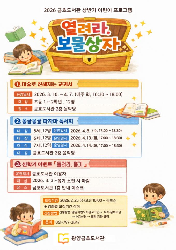ÇÑÆí, 2026³â ±ÝÈ£µµ¼­°ü »ó¹Ý±â ¾î¸°ÀÌ ÇÁ·Î±×·¥°ú °ü·ÃÇÑ ÀÚ¼¼ÇÑ »çÇ×Àº ±¤¾ç½Ã¸³µµ¼­°ü ´©¸®Áý(https://lib.gwangyang.go.kr)¿¡¼­ È®ÀÎÇϰųª ±ÝÈ£µµ¼­°ü(¢Ï061-797-3847)À¸·Î ¹®ÀÇÇÏ¸é ¾È³»¹ÞÀ» ¼ö ÀÖ´Ù.