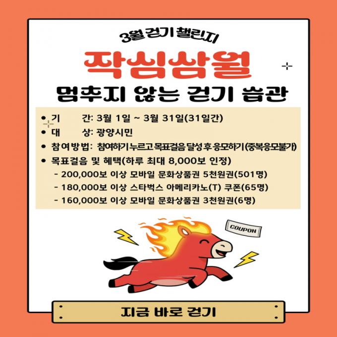 [½Ã»çÁ¾ÇսŹ® = ¿À½ÂÅà ±âÀÚ] ±¤¾ç½Ã´Â ¿À´Â 3¿ù 1ÀϺÎÅÍ 3¿ù 31ÀϱîÁö ÇÑ ´Þ°£ ¸ð¹ÙÀÏ °È±â ¾Û ¿öÅ©¿ÂÀ» Ȱ¿ëÇÑ ¡®À۽ɻï¿ù, ¸ØÃßÁö ¾Ê´Â °È±â ½À°ü! 3¿ù °È±â 縰Áö¡¯¸¦ ¿î¿µÇÑ´Ù°í 24ÀÏ ¹àÇû´Ù.