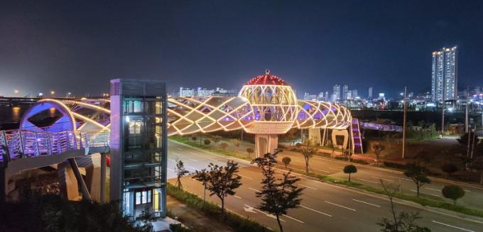 ¾Æ¿ï·¯ ¹«Áö°³´Ù¸®¿Í ÇØ¿À¸§À°±³, À̼ø½Å´ë±³´Â ÇØºñÄ¡·ÎÀÇ »ó¡Àû °æ°ü ¿ä¼Ò´Ù. ¹«Áö°³´Ù¸®´Â »ïÈ­¼¶À» ¿¬°áÇÏ´Â º¸Çà Åë·Î·Î °ø°£ÀÇ Á¢±Ù¼ºÀ» ³ôÀ̰í, ÇØ¿À¸§À°±³´Â ³·¿¡´Â µµ½É°ú ¼öº¯À» ÀÕ´Â »ýȰÇü º¸Çà±³·Î ±â´ÉÇÏ¸ç ¾ß°£¿¡´Â Ȳ±Ýºû°ú º¸¶ùºû °æ°üÁ¶¸íÀÌ ´õÇØÁ® ¾ß°£ °æ°üÀ» ¿¬ÃâÇÑ´Ù. À̼ø½Å´ë±³´Â ±¤¾ç¸¸À» °¡·ÎÁö¸£´Â ¿õÀåÇÑ ÁÖžÀ¸·Î ÀÏ´ë ½ºÄ«À̶óÀÎÀ» Çü¼ºÇÑ´Ù.