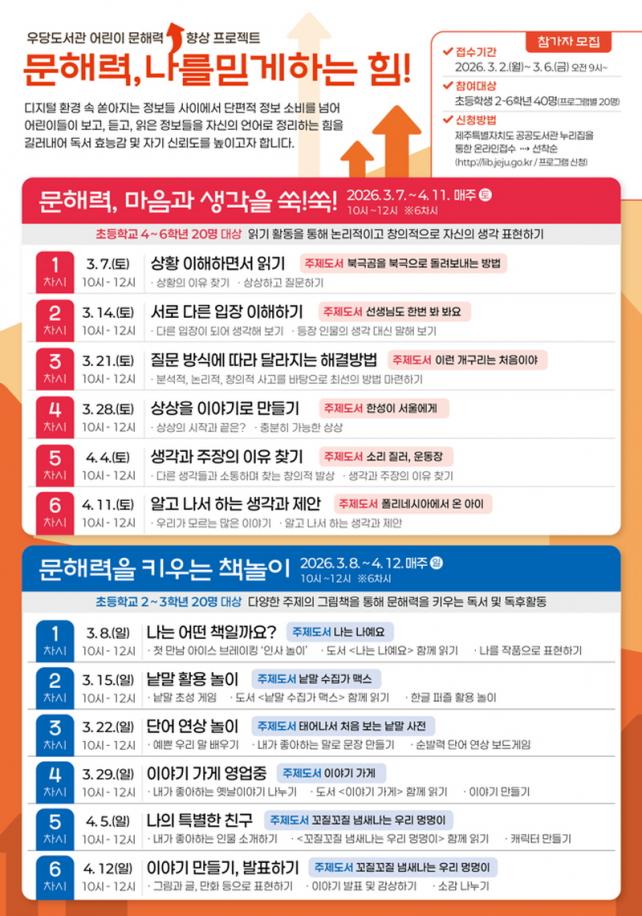 Âü°¡ ½ÅûÀº ¿À´Â 3¿ù 2ÀϺÎÅÍ 3¿ù 6ÀϱîÁö Á¦ÁÖÆ¯º°ÀÚÄ¡µµ °ø°øµµ¼°ü ´©¸®Áý(lib.jeju.go.kr)À» ÅëÇØ ¿Â¶óÀÎÀ¸·Î Á¢¼öÇÏ¸é µÈ´Ù. ¸ðÁý ÀοøÀº °úÁ¤º° 20¸í¾¿ ¼±Âø¼øÀ¸·Î ¸¶°¨µÈ´Ù.