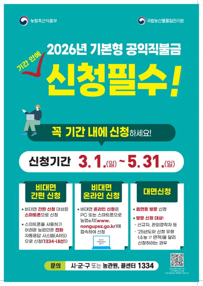 ½ÅûÀº ºñ´ë¸é°ú ¹æ¹® ½ÅûÀ» º´ÇàÇØ ÃßÁøÇÑ´Ù. 2025³â ±âº»Á÷ºÒ µî·ÏÁ¤º¸¿Í 2026³â ³ó¾÷°æ¿µÃ¼ µî·ÏÁ¤º¸¿¡ º¯µ¿ÀÌ ¾ø°í, »çÀü ÀÚ°Ý °ËÁõ °á°ú Àû°ÝÀ¸·Î È®ÀÎµÈ ³ó¾÷ÀÎÀº ½º¸¶Æ®Æù ¸ð¹ÙÀÏ ½Åû ¶Ç´Â ÀÚµ¿ÀÀ´ä½Ã½ºÅÛ(ARS1334-1)À» ÅëÇØ °£ÆíÇÏ°Ô ½ÅûÇÒ ¼ö ÀÖ´Ù.