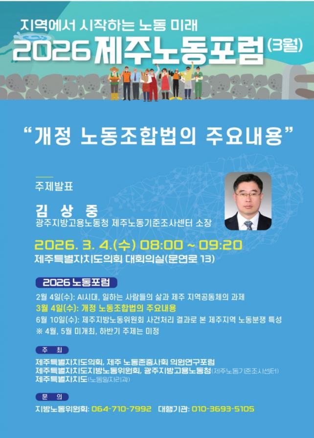 [½Ã»çÁ¾ÇսŹ® = °í¼º¹Î ±âÀÚ] Á¦ÁÖÆ¯º°ÀÚÄ¡µµ Áö¹æ³ëµ¿À§¿øÈ¸(À§¿øÀå ±ÝÁ¤¼ö)´Â Á¦ÁÖµµÀÇȸ, Á¦Áֳ뵿Á¸Áß»çȸÀÇ¿ø¿¬±¸Æ÷·³°ú °øµ¿À¸·Î ¡®2026³â Á¦Áֳ뵿Æ÷·³¡¯À» 4ÀÏ ¿ÀÀü 8½Ã Á¦ÁÖµµÀÇȸ ´ëȸÀǽǿ¡¼­ °³ÃÖÇÑ´Ù.
