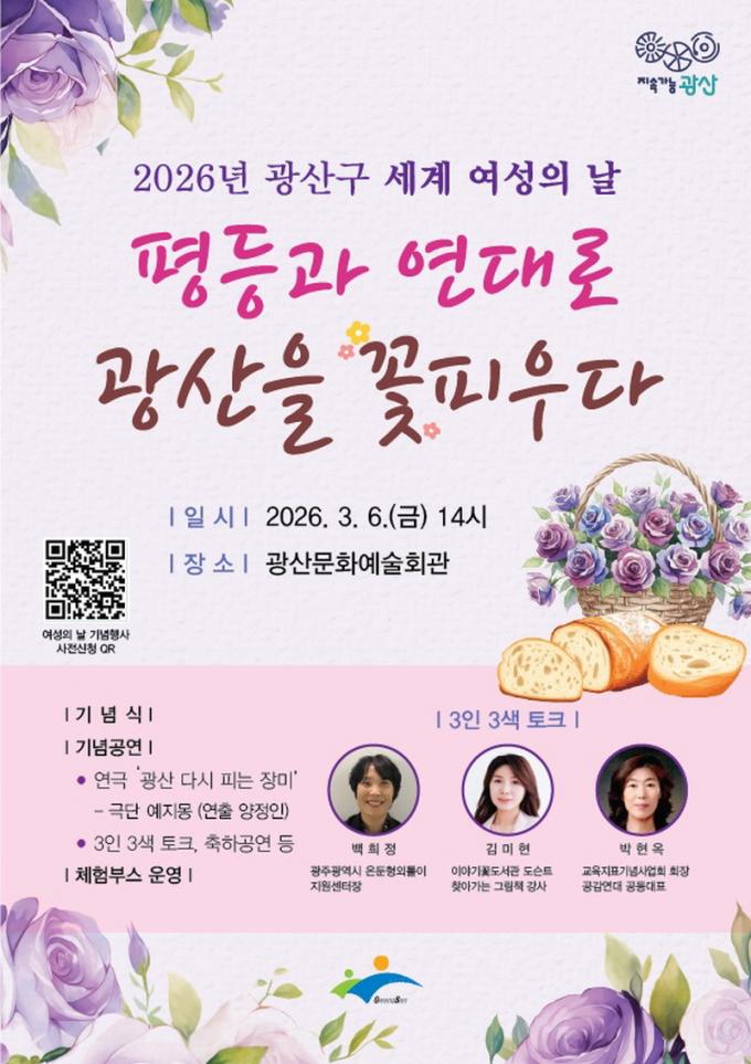 ¿ì¼± ÀÌ¿ôÀÇ À̾߱⸦ ¹«´ë¿¡ ¿Ã¸®´Â ±â³ä ¿¬±Ø ¡®±¤»ê ´Ù½Ã ÇÇ´Â Àå¹Ì(±Ø´Ü ¿¹Áö¸ù)¡¯°¡ ÆîÃÄÁø´Ù. ¿¬±ØÀº ±¤»ê±¸¿¡ »ç´Â ¼¼ ¿©¼ºÀÇ ÀÏ»óÀ» ÅëÇØ ¿©¼º ÀαÇ, ¸ðµÎ°¡ Á¸¾öÇÏ°Ô »ì¾Æ°¥ ±Ç¸®ÀÇ Àǹ̸¦ ´ã´ãÇϸ鼵µ ±íÀÌ ÀÖ°Ô ±×·Á³»¸ç, °ø°¨°ú ¿ï¸²À» Àü´ÞÇÒ ¿¹Á¤ÀÌ´Ù.