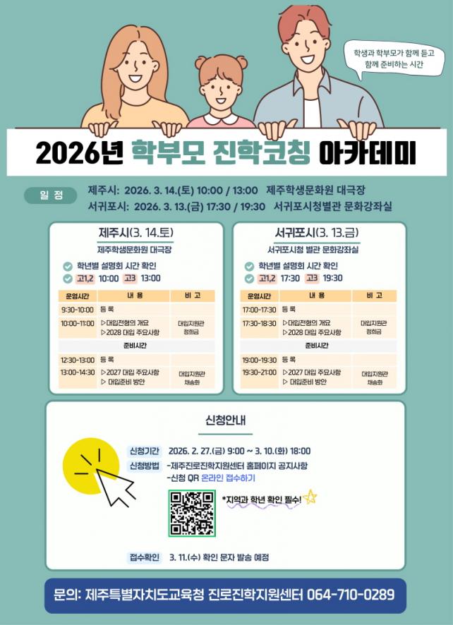 [½Ã»çÁ¾ÇսŹ® = °í¼º¹Î ±âÀÚ] Á¦ÁÖÆ¯º°ÀÚÄ¡µµ±³À°Ã»Àº ´ëÀÔ Á¤º¸ Á¦°øÀ» À§ÇÑ ¡®2026³â Çкθð ÁøÇÐÄÚĪ ¾ÆÄ«µ¥¹Ì¡¯¸¦ ³»´Þ 13ÀÏ(±Ý) ¼­±ÍÆ÷½Ãû ¹®È­°­Á½ǰú 14ÀÏ(Åä) Á¦ÁÖÇлý¹®È­¿ø¿¡¼­ °³ÃÖÇÑ´Ù.