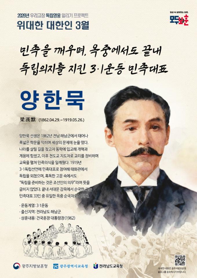 [½Ã»çÁ¾ÇսŹ® = ¿À½ÂÅà ±âÀÚ] ±¤ÁÖÁö¹æº¸ÈÆÃ»(ûÀå Á÷¹«´ë¸® ±èÁ¾ÀÏ)Àº 2026³â 3¿ù ¡®¿ì¸®°íÀå À§´ëÇÑ ´ëÇÑÀΡ¯À¸·Î 3¡¤1¿îµ¿ ¹ÎÁ·´ëÇ¥ÀÎ ¾çÇѹ¬ ¼±»ýÀ» ¼±Á¤Çß´Ù.