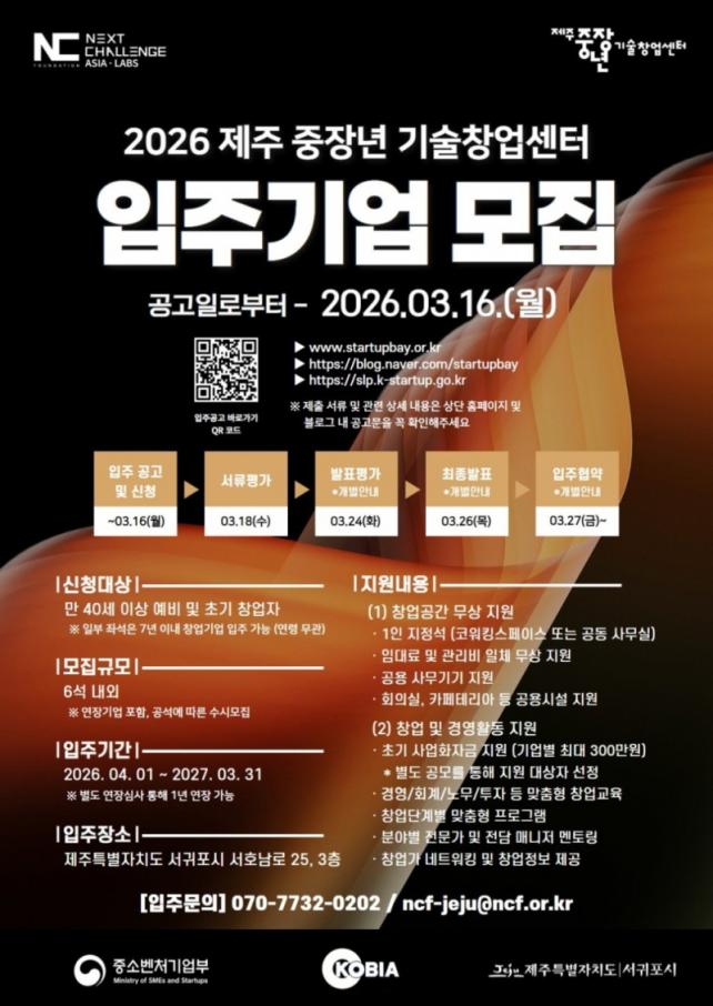 ÁÖ¿ä ÀÔÁÖ ´ë»óÀº 40¼¼ ÀÌ»óÀÇ ¿¹ºñ ¹× Ãʱâ â¾÷ÀÚÀ̸ç ÀϺΠÁ¼®¿¡ ´ëÇØ¼´Â ¿¬·É°ú ¹«°üÇÏ°Ô 7³â À̳»ÀÇ ¾÷·ÂÀ» °¡Áø »ç¾÷ÀÚµµ ÀÔÁÖÇÒ ¼ö ÀÖ´Ù. ÀÔÁÖ°ø°£Àº Á¦ÁÖÇõ½Åµµ½Ã º¹ÇÕÇõ½Å¼¾ÅÍ 3Ãþ(¼±ÍÆ÷½Ã ¼È£³²·Î 25)¿¡ À§Ä¡ÇØ ÀÖÀ¸¸ç, °øµ¿Çü »ç¹«½Ç ³» 1ÀÎ ÁöÁ¤¼®À¸·Î Áö¿øµÈ´Ù.