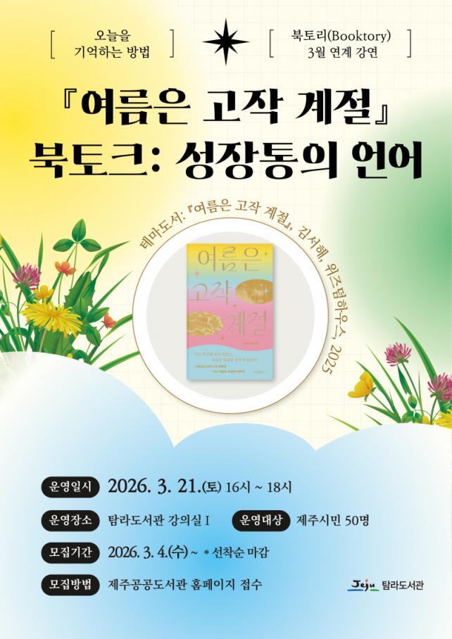 3¿ù ºÏÅ丮´Â ¡®»ì¾Æ°¡¸ç ¸¶ÁÖÇÏ´Â ÀλýÀÇ Áú¹®-ûÃá°ú ¼ºÀ塯À» Å׸¶·Î ÁÖÁ¦ µµ¼­ÀÎ ¡®¿©¸§Àº °íÀÛ °èÀý¡¯À» ÇÔ²² ÀÐÀ¸¸ç, ÀÛǰÀ» ÅëÇØ ûÃáÀÇ ¼ºÀåÅëÀ» Åë°úÀÇ·Ê ÀÌ»óÀÇ °¨°¢À¸·Î ÀçÇØ¼®Çϰí, »ó½ÇÀ» °ßµð´Â ¹æ½ÄÀ» Ž»öÇÏ´Â ½Ã°£À¸·Î ¸¶·ÃÇß´Ù.