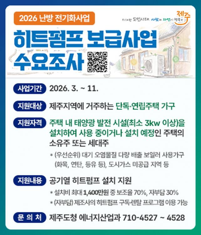 ¿ÃÇØ Á¤ºÎ ¿¹»êÀº ÃÑ 144¾ï 4,800¸¸ ¿øÀ¸·Î, ÀÌ Áß Á¦ÁÖ¿¡ 133¾ï 2,800¸¸ ¿ø(92.2%)ÀÌ ¹èÁ¤µÆ´Ù. Á¦ÁÖ¿¡ ¿¹»êÀÌ ÁýÁßµÈ °ÍÀº Àç»ý¿¡³ÊÁö º¸±Þ·üÀÌ ³ô¾Æ È÷Æ®ÆßÇÁ¿ÍÀÇ ¿¬°è È¿°ú°¡ Å©±â ¶§¹®ÀÌ´Ù. ¿ÃÇØ Á¦ÁÖ º¸±Þ ¸ñÇ¥´Â 1,563¼¼´ëÀ̸ç, ±¹ºñ Áõ¾×À̳ª ºÎ´ã·ü Á¶Á¤¿¡ µû¶ó º¯µ¿µÉ ¼ö ÀÖ´Ù. »ç¾÷ ´ë»óÀº ž籤 ¹ßÀü½Ã¼³(ÃÖ¼Ò 3§Ò ÀÌ»ó)À» ¼³Ä¡Ç߰ųª ¼³Ä¡ ¿¹Á¤ÀÎ ´Üµ¶¡¤¿¬¸³ÁÖÅÃÀÌ´Ù. 20§Ò ¹Ì¸¸ÀÇ °¡Á¤¿ë °ø±â¿ È÷Æ®ÆßÇÁ¿Í VPP(¿·®°è µî) ¼³ºñ¸¦ º¸±ÞÇÑ´Ù.