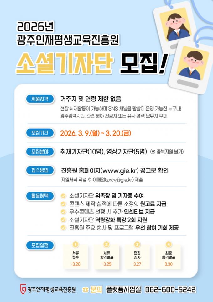 ¸ðÁýÀοøÀº ÃÑ 15¸íÀ¸·Î, ¡ãÀ¥Áø ¡®¹«µ¹¾¾ÀÇ ¸¶¸£Áö ¾Ê´Â »ù¡¯ ±â»ç¿Í SNS ÄÜÅÙÃ÷¸¦ Á¦ÀÛÇÒ ÃëÀç±âÀÚ´Ü(10¸í)°ú ¡ãAI ±â¹Ý ÅøÀ» Ȱ¿ëÇØ ¼ôÆû ¿µ»óÀ» Á¦ÀÛÇÒ ¿µ»ó±âÀÚ´Ü(5¸í)À¸·Î ³ª´©¾î ¼±¹ßÇÑ´Ù. Æò»ý±³À° ÇöÀå ÃëÀç°¡ °¡´ÉÇϰí, SNS ä³ÎÀ» Ȱ¹ßÈ÷ ¿î¿µÇÏ´Â »ç¶÷À̶ó¸é ´©±¸³ª Áö¿øÇÒ ¼ö ÀÖ´Ù.