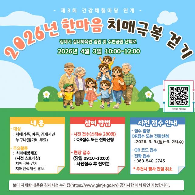 Âü°¡ ½ÅûÀº ¿À´Â 25ÀϱîÁö ¼±Âø¼ø 280¸í »çÀü Á¢¼ö·Î ÁøÇàµÇ¸ç ±èÁ¦½Ã SNS °øÁö ¹× ´©¸®Áý Æ÷½ºÅÍ QRÄÚµå ¶Ç´Â ÀüÈ(063-540-2745)¸¦ ÅëÇØ ½ÅûÇÒ ¼ö ÀÖ´Ù. »çÀü Á¢¼ö ÈÄ ÀÜ¿© Àοø¿¡ ÇÑÇØ Çà»ç ´çÀÏ ÇöÀå Á¢¼öµµ °¡´ÉÇÏ´Ù.