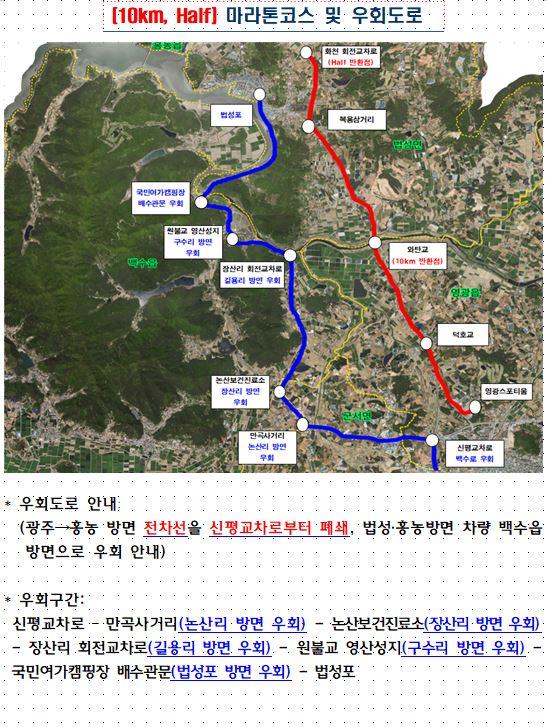 ±¹µµ 22È£¼±ÀÇ ¹ý¼º¡¤È«³ó¹æ¸é ½ÅÆò±³Â÷·ÎºÎÅÍ Àü¸éÅëÁ¦¿¡ µû¸¥ 10km, Half ÄÚ½º ¿ìȸ±¸°£Àº ½ÅÆò±³Â÷·Î – ¸¸°î»ç°Å¸® – ³í»êº¸°ÇÁø·á¼Ò – Àå»ê¸® ȸÀü±³Â÷·Î – ¿øºÒ±³ ¿µ»ê¼ºÁö – ±¹¹Î¿©°¡Ä·ÇÎÀå – ¹ý¼ºÆ÷ ¹æ¸éÀ¸·Î ¾È³»ÇÒ °èȹÀÌ´Ù.