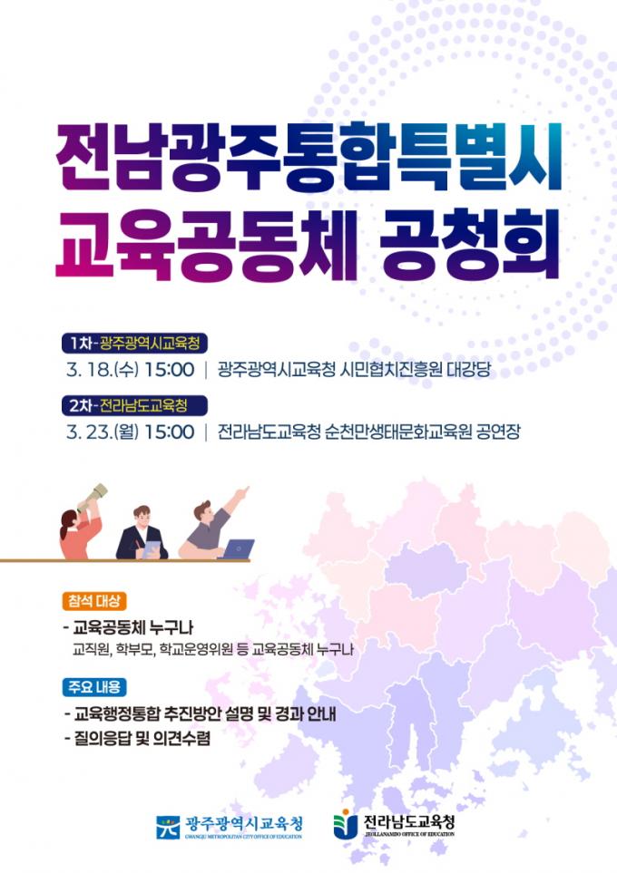 ƯÈ÷, ±¤ÁÖ ½Ç¹«Áغñ´Ü°ú Àü³² ÅëÇÕÃßÁø´Ü °ü°èÀÚµéÀÌ ÃßÁø °æ°ú¸¦ ¼³¸íÇϰí, À̾î ÀÌÁ¤¼± ±¤Áֽñ³À°°¨°ú ±è´ëÁß Àü³²µµ±³À°°¨ÀÌ Âü¼®ÀÚµéÀÇ ÁúÀÇ¿¡ ÀÀ´äÇÏ¸ç ±Ã±ÝÁõÀ» ÇØ¼ÒÇÒ ¿¹Á¤ÀÌ´Ù. °øÃ»È¸¿¡´Â ±³Á÷¿ø, Çкθð, Çб³¿î¿µÀ§¿ø µî ±³À°°øµ¿Ã¼ ´©±¸³ª Âü¿©ÇØ ÀǰßÀ» ³¾ ¼ö ÀÖ´Ù. ±¤ÁÖ ½Ç¹«Áغñ´Ü°ú Àü³² ÅëÇÕÃßÁø´ÜÀº ¸ÅÁÖ ÇùÀÇȸ¸¦ ¿°í, ÅëÇÕ±³À°Ã¼°è ±¸ÃàÀ» À§ÇÑ ·Îµå¸ÊÀ» ±¸Ã¼ÈÇÒ °èȹÀÌ´Ù. ¶Ç Àü»êÅëÇÕ µî ºÐ¾ßº° ½Ç¹« ÇùÀÇü¸¦ ±¸¼ºÇØ ±³À°ÇàÁ¤ÅëÇÕÀÌ Â÷Áú ¾øÀÌ ÃßÁøµÇµµ·Ï ÇÑ´Ù.