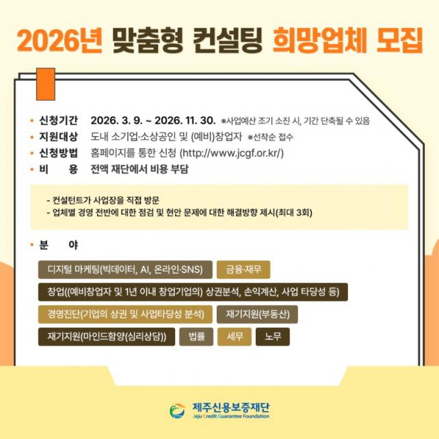 [½Ã»çÁ¾ÇսŹ® = °í¼º¹Î ±âÀÚ] Á¦Áֽſ뺸ÁõÀç´Ü (ÀÌ»çÀå ¿À±¤¼®, ÀÌÇÏ Àç´Ü)Àº ±Þº¯ÇÏ´Â °æ¿µÈ¯°æ°ú ¼ÒºñÀÚ Æ®·»µå¿¡ ´ëÀÀÇÒ ¼ö ÀÖ´Â ±â¾÷°¡Çü ¼Ò»ó°øÀÎÀ» À°¼ºÇϱâ À§ÇØ ¡¸2026³âµµ ¸ÂÃãÇü ÄÁ¼³ÆÃ »ç¾÷¡¹¿¡ Âü¿©ÇÒ Èñ¸Á ¾÷ü¸¦ 3¿ù 9ÀϺÎÅÍ ¸ðÁýÇϰí ÀÖ´Ù°í ¹àÇû´Ù.