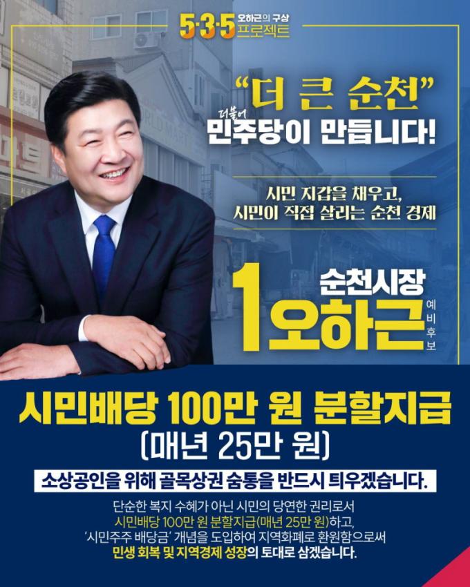 ¿ÀÇϱ٠¼øÃµ½ÃÀå ¿¹ºñÈĺ¸, ¼øÃµ ½Ã¹Î¿¡°Ô ¸Å³â 25¸¸ ¿ø ¹è´ç ¾à¼Ó °ø¾à ¹ßÇ¥