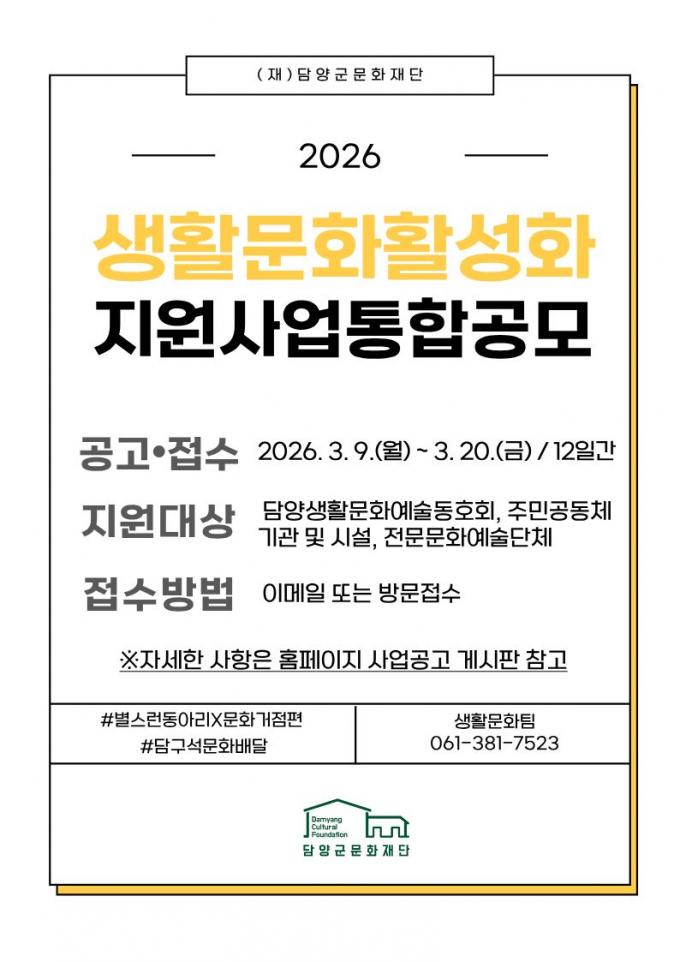ÇØ´ç »ç¾÷Àº ¡ã2026 »ýȰ¹®È¿¹¼ú µ¿¾Æ¸®Áö¿ø»ç¾÷ <º°½º·±µ¿¾Æ¸®_¹®È°ÅÁ¡Æí> ¡ã2026 ã¾Æ°¡´Â ¹®È¿¹¼úÁö¿ø»ç¾÷ <´ã±¸¼®¹®È¹è´Þ> ÃÑ 2°³ »ç¾÷À¸·Î ´ã¾ç±º À¾¡¤¸é ´ÜÀ§ Áö¿ª¹ÎµéÀÇ ÀÏ»ó ¼Ó¿¡¼ ¹®È¿¹¼úÀ» °æÇèÇϰí Âü¿©ÇÒ ±âȸ¸¦ È®´ëÇϱâ À§ÇØ ÃßÁøµÈ´Ù. ¡®2026 »ýȰ¹®È¿¹¼ú µ¿¾Æ¸®Áö¿ø»ç¾÷ <º°½º·±µ¿¾Æ¸®_¹®È°ÅÁ¡Æí>¡¯Àº Áö¿ª µ¿¾Æ¸®ÀÇ ÀÚÀ²ÀûÀÎ ¹®È¿¹¼ú Ȱµ¿À» Áö¿øÇÏ´Â »ç¾÷À¸·Î ¹®È°ÅÁ¡ °ø°£À» Áß½ÉÀ¸·Î ÁֹεéÀÌ ÀÏ»ó ¼Ó¿¡¼ ¹®È¿¹¼ú Ȱµ¿¿¡ Âü¿©ÇÒ ¼ö ÀÖµµ·Ï Áö¿øÇϰí Áö¿ª ³» »ýȰ¹®È ±â¹ÝÀ» È®´ëÇϰíÀÚ ÇÑ´Ù.