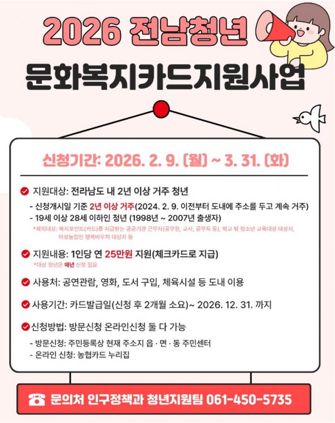 Áö¿ø ´ë»óÀº 2024³â 2¿ù 9ÀÏ ÀÌÀüºÎÅÍ Àü¶ó³²µµ¿¡ ÁÖ¼Ò¸¦ µÎ°í ¹«¾È±º¿¡ 2³â ÀÌ»ó °ÅÁÖÇÑ 19¼¼ºÎÅÍ 28¼¼±îÁö(1998~2007³â Ãâ»ý) û³âÀÌ´Ù. ´ë»óÀÚ·Î ¼±Á¤µÇ¸é 1ÀÎ´ç ¿¬ 25¸¸ ¿øÀÇ ¹®Èº¹Áöºñ¸¦ üũīµå Æ÷ÀÎÆ® ÇüÅ·ΠÁö¿ø¹Þ°Ô µÈ´Ù.