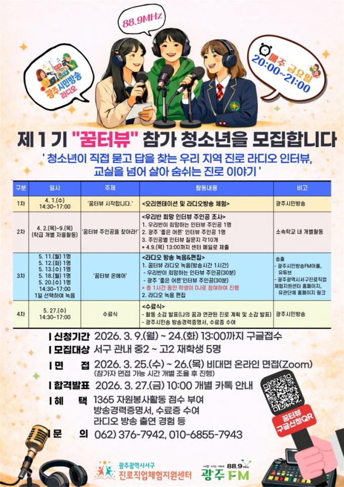 ¸ÕÀú ¡®²ÞÅͺ䡯´Â û¼Ò³âÀÌ Á÷Á¢ ÀÎÅͺä¾î°¡ µÇ¾î Áö¿ªÀÇ ´Ù¾çÇÑ Á÷¾÷ÀÎÀ» ¸¸³ª Áø·Î À̾߱⸦ µè°í ¶óµð¿À ¹æ¼ÛÀ» ÅëÇØ °øÀ¯ÇÏ´Â ÇÁ·Î±×·¥ÀÌ´Ù. Âü¿© ÇлýµéÀº ÀÎÅͺä ÁÖÁ¦¸¦ ±âȹÇϰí Áú¹®À» ÁغñÇÏ´Â °úÁ¤ºÎÅÍ ½ÇÁ¦ ¶óµð¿À ³ìÀ½±îÁö Àü °úÁ¤À» °æÇèÇÏ°Ô µÈ´Ù. À̸¦ ÅëÇØ û¼Ò³âµéÀº ´Ù¾çÇÑ Á÷¾÷ ¼¼°è¸¦ ÀÌÇØÇϰí ÀÚ½ÅÀÇ Áø·Î ¹æÇâÀ» Ž»öÇÒ ¼ö ÀÖ´Ù.