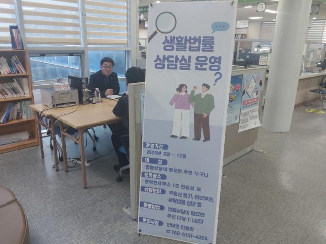 ¾È´ö¸éÀº 3¿ù 5ÀÏ ¾È´ö¸é»ç¹«¼Ò 1Ãþ ¹Î¿ø½Ç ³»¿¡ ¹ý·üÀû Á¶¾ðÀÌ ÇÊ¿äÇÑ ÁֹεéÀ» ´ë»óÀ¸·Î ¿ÃÇØ ù¡®¹«·á »ýȰ¹ý·ü »ó´ã½Ç¡¯À» ¿î¿µÇßÀ¸¸ç, ´Ù°¡¿À´Â 19ÀÏ µÎ ¹øÂ° ¹ý·ü »ó´ãÀÌ ÀÌ·ç¾îÁú ¿¹Á¤ÀÌ´Ù.