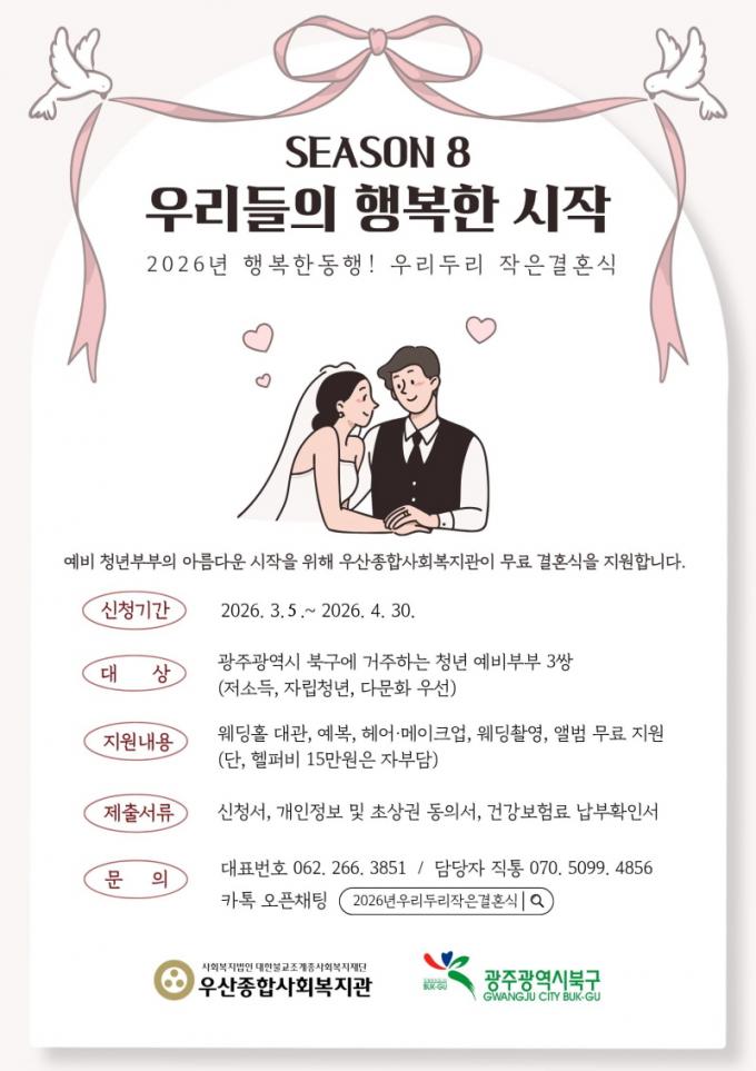 º» ¿¹½ÄÀº 9¿ù~11¿ù Áß ¹®Èﵿ ±î»çµð·çü ¿þµùȦ¿¡¼ ÁøÇàµÈ´Ù. ¹«·á·Î °áÈ¥½ÄÀ» ¿Ã¸®°í ½ÍÀº ºÎºÎ´Â ºÏ±¸Ã» ´©¸®Áý¿¡ °Ô½ÃµÈ °øÁö »çÇ×À» Âü°íÇØ ±¸ºñ¼·ù¸¦ ¿ì»êÁ¾ÇÕ»çȸº¹Áö°ü(ºÏ±¸ Áß¹®·Î 55)¿¡ Á¦ÃâÇÏ¸é µÈ´Ù.