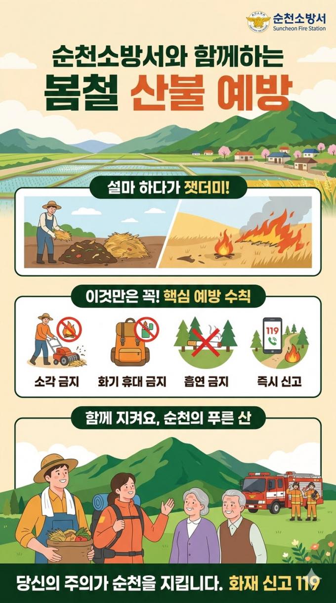 ¼øÃµ Áö¿ªÀº Á¶°è»ê, ºÀÈ»ê µî ÁÖ¿ä »ê¸² ÀÚ¿øÀÌ ¸¹°í ³ó°¡ ºñÁßÀÌ ³ô¾Æ, º½Ã¶ ¿µ³ó ºÎ»ê¹° ¼Ò°¢À̳ª µî»ê°´ ºÎÁÖÀÇ¿¡ ÀÇÇÑ ÈÀç À§ÇèÀÌ »ó½Ã Á¸ÀçÇÑ´Ù. ÀÌ¿¡ ¼øÃµ¼Ò¹æ¼´Â »ê¸² ÀÎÁ¢ Áö¿ª ¼øÂûÀ» °ÈÇϰí ÈÀç ¿¹¹æ Ä·ÆäÀÎÀ» ÁýÁß Àü°³Çϰí ÀÖ´Ù.