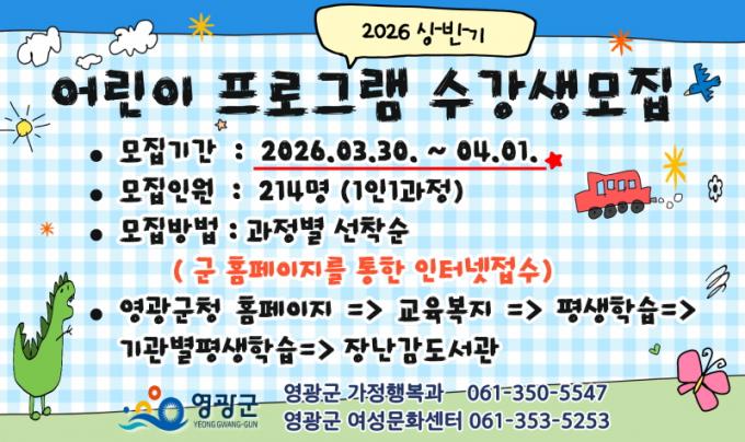 ¼ö°½ÅûÀº ¿µ±¤±º¿¡ ÁÖ¼Ò¸¦ µÎ°í °ÅÁÖÇÏ´Â ¾Æµ¿ÀÌ¸é ´©±¸³ª °¡´ÉÇϰí, ¿µ±¤±º ȨÆäÀÌÁö¸¦ ÅëÇØ ¿Â¶óÀÎÀ¸·Î ½ÅûÀÌ °¡´ÉÇÏ´Ù. ±âŸ ÀÚ¼¼ÇÑ »çÇ×Àº ¿µ±¤±º ¿©¼º¹®È¼¾ÅÍ(¢Î353-5253) ¶Ç´Â °¡Á¤Çູ°ú °¡Á·º¹ÁöÆÀ(¢Î350-5547)À¸·Î ¹®ÀÇÇÏ¸é µÈ´Ù.