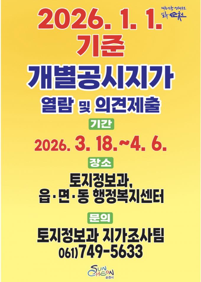 [½Ã»çÁ¾ÇսŹ® = ¿À½ÂÅà ±âÀÚ] ¼øÃµ½Ã´Â 2026³â 1¿ù 1ÀÏ ±âÁØ °³º°°ø½ÃÁö°¡ÀÇ ¿­¶÷ ¹× ÀǰßÁ¦ÃâÀ» 3¿ù 18ÀϺÎÅÍ 4¿ù 6ÀϱîÁö Á¢¼öÇÑ´Ù°í ¹àÇû´Ù.