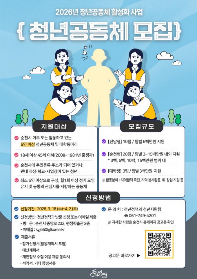 [½Ã»çÁ¾ÇսŹ® = ¿À½ÂÅà ±âÀÚ] ¼øÃµ½Ã´Â û³âµéÀÇ ¾ÆÀ̵ð¾î¿Í ÄÜÅÙÃ÷·Î Áö¿ª ³»¿¡¼­ ÆîÄ¡´Â ´Ù¾çÇÑ È°µ¿À» Áö¿øÇÏ´Â 2026³â 「û³â°øµ¿Ã¼ Ȱ¼ºÈ­ »ç¾÷」ÀÇ Âü¿© °øµ¿Ã¼¸¦ ¸ðÁýÇÑ´Ù°í ¹àÇû´Ù.