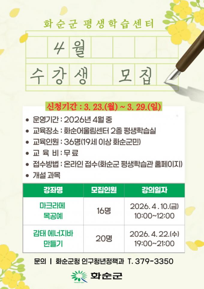 ÇÁ·Î±×·¥Àº È­¼ø ¾î¿ï¸²¼¾ÅÍ ³» Æò»ýÇнÀ¼¾ÅÍ¿¡¼­ ÁøÇàµÇ¸ç, ¸ðÁý ÀοøÀº 19¼¼ ÀÌ»ó È­¼ø±º¹Î 36¸íÀÌ´Ù. ±³À°ºñ´Â ¹«·áÀÌ´Ù.