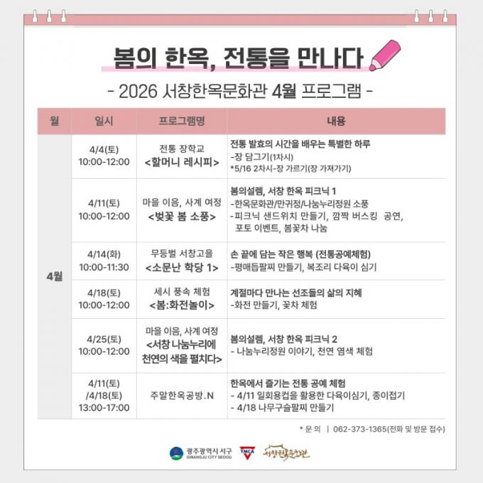 ÇÁ·Î±×·¥ Âü¿© ½ÅûÀº ¼Ã¢ÇÑ¿Á¹®È°ü¿¡ ¹æ¹®Çϰųª ÀüÈ(062-373-4365)¸¦ ÅëÇØ °¡´ÉÇϸç ÇÁ·Î±×·¥º° Àç·áºñ µî ÀϺΠÂü°¡ºñ°¡ ÀÖ´Ù.