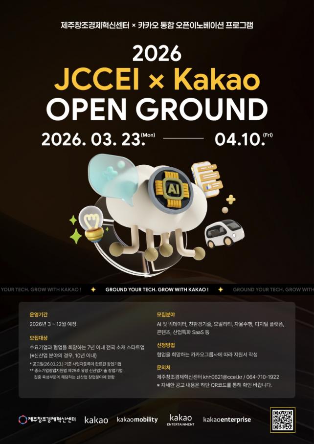 [½Ã»çÁ¾ÇսŹ® = °í¼º¹Î ±âÀÚ] Á¦ÁÖâÁ¶°æÁ¦Çõ½Å¼¾ÅÍ(´ëÇ¥ÀÌ»ç À̺´¼±, ÀÌÇÏ Á¦ÁÖ¼¾ÅÍ)´Â ÁÖ½Äȸ»ç īī¿À(´ëÇ¥ Á¤½Å¾Æ, ÀÌÇÏ Ä«Ä«¿À)¿Í ¿ì¼ö ½ºÅ¸Æ®¾÷ ¹ß±¼°ú µ¿¹Ý ¼ºÀåÀ» À§ÇÑ ¿ÀÇÂÀ̳뺣ÀÌ¼Ç ÇÁ·Î±×·¥ ¡®2026 JCCEI X Kakao ¿ÀÇ ±×¶ó¿îµå¡¯ÀÇ Âü°¡±â¾÷À» ¸ðÁýÇÑ´Ù°í ¹àÇû´Ù.