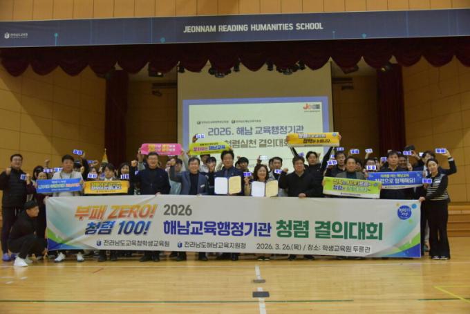 [½Ã»çÁ¾ÇսŹ® = °­À±¿À ±âÀÚ] ÇØ³²±³À°Áö¿øÃ»(±³À°Àå Á¶¿¬ÁÖ)°ú Àü¶ó³²µµ±³À°Ã»Çлý±³À°¿ø(¿øÀå ±èâ±Ù)Àº 3¿ù 26ÀÏ Çлý±³À°¿ø µÎ·û°ü¿¡¼­, ÇØ³² ±³À°ÇàÁ¤±â°ü ±³Á÷¿øµéÀÌ Âü¿©ÇÑ °¡¿îµ¥ ¡®2026³â ÇØ³² ±³À°ÇàÁ¤±â°ü û·Å½Çõ°áÀÇ´ëȸ¡¯¸¦ ½Ç½ÃÇÏ¿© °øÁ¤ÇÏ°í ½Å·Ú¹Þ´Â Ã»·Å ±³À°ÇàÁ¤ ½Çõ ÀÇÁö¸¦ ´ÙÁüÇß´Ù.