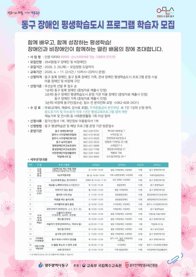 À̿ܿ¡µµ µ¿±¸´Â Àå¾ÖÀÎÀÇ »ý¾ÖÁÖ±â¿Í ´Ù¾çÇÑ ÇнÀ ¿å±¸¸¦ ¹Ý¿µÇÑ ÇÁ·Î±×·¥À» Áö¼ÓÀûÀ¸·Î ¹ß±¼¡¤¿î¿µÇÏ¿© ÇнÀ Âü¿© ±âȸ¸¦ È®´ëÇϰí, Áö¿ª ³» À¯°ü±â°ü°ú Çù·ÂÀ» ±â¹ÝÀ¸·Î Áö¼Ó °¡´ÉÇÑ Àå¾ÖÀÎ Æò»ýÇнÀ »ýŰ踦 ±¸ÃàÇØ ³ª°¥ ¿¹Á¤ÀÌ´Ù.